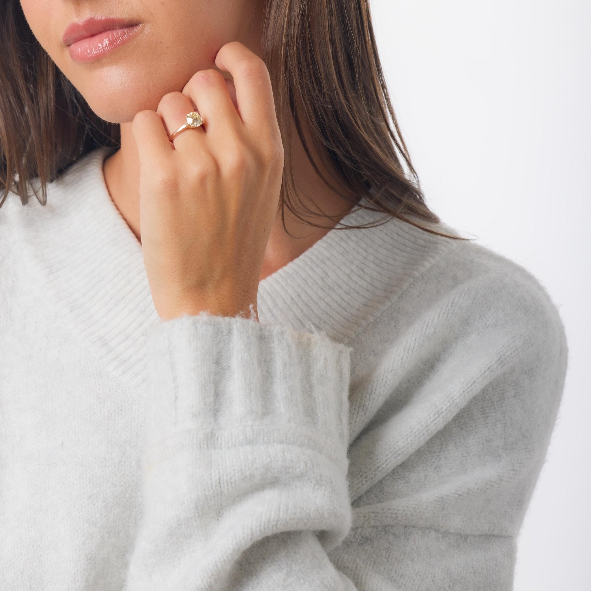 The solitaire design is intentionally refined, drawing all attention to the diamond itself—an approach that highlights the stone’s impressive presence and antique character. Crafted in the 1970s, the ring bridges eras effortlessly, combining vintage diamond charm with a clean, confident silhouette that feels timeless and elegant. The rose gold adds a romantic depth and softness, enhancing the diamond’s warmth and giving the ring a distinctive, intimate feel on the hand.
