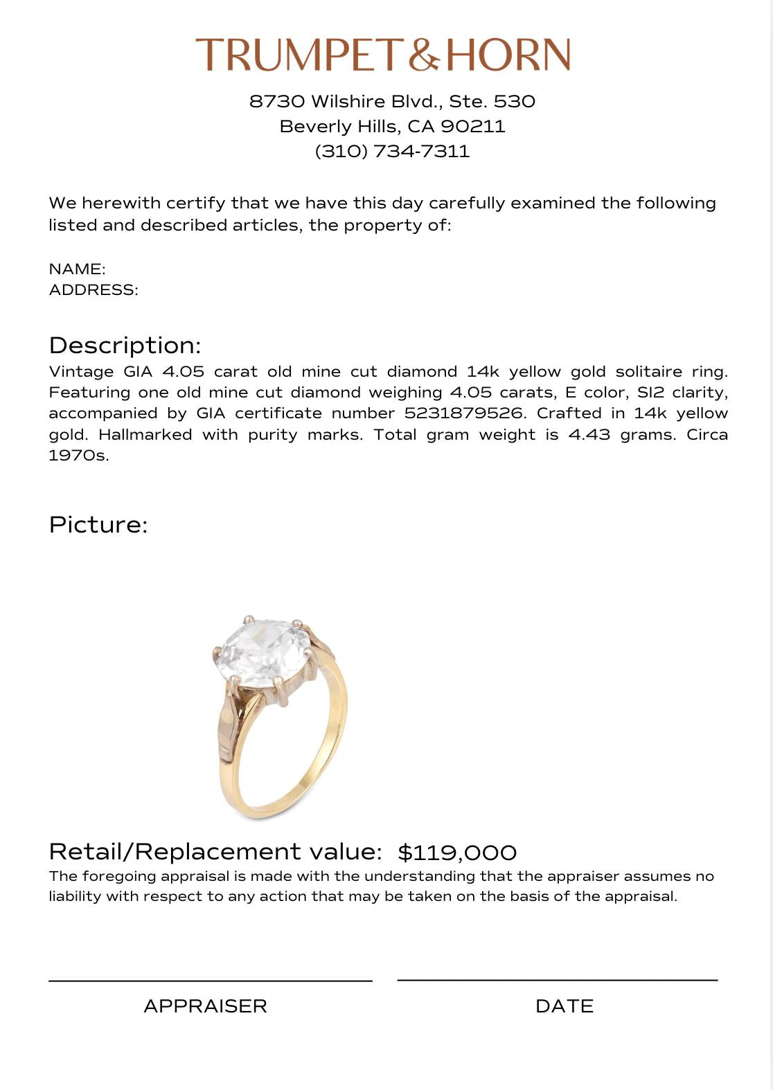 Vintage GIA 4.05 carat old mine cut diamond 14k yellow gold solitaire ring