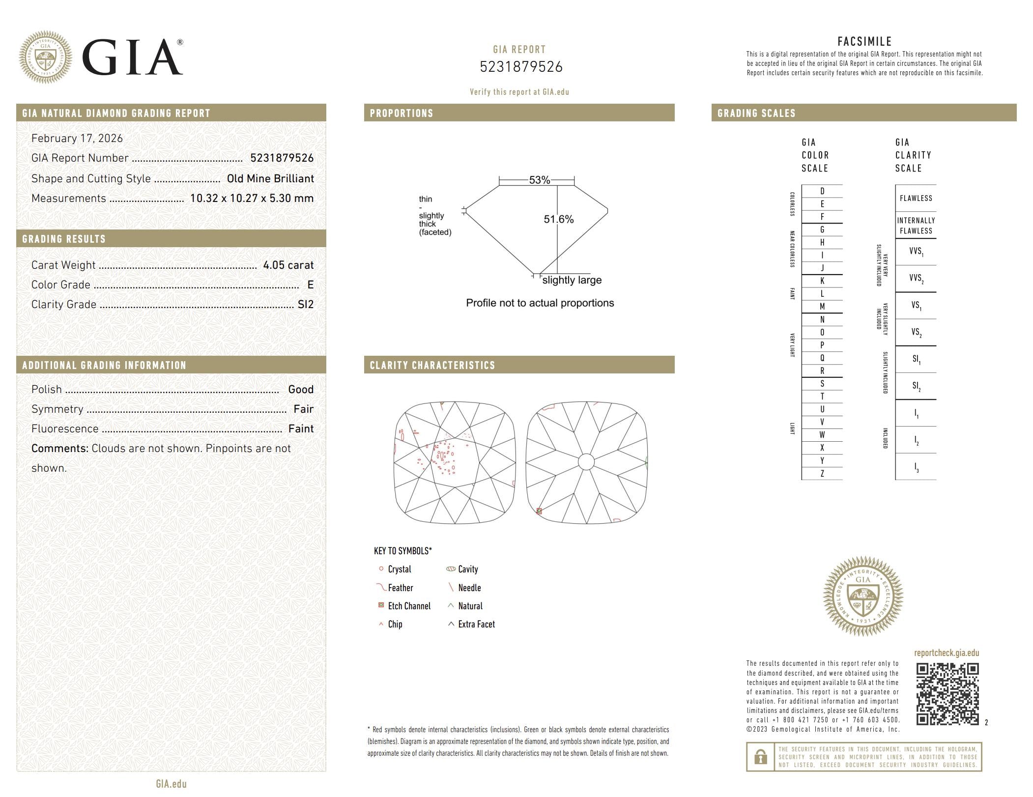 A remarkable vintage solitaire ring showcasing a magnificent 4.05 carat old mine cut diamond certified by GIA. The antique diamond displays the distinctive charm of early cutting styles, with softly rounded corners, a high crown, and broad facets that create romantic flashes of light. Its exceptional E color adds remarkable brightness and rarity, while the generous size of the stone gives the ring extraordinary presence.